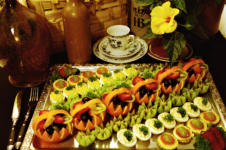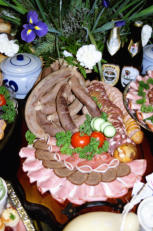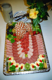 Gefüllte Eier, Kochschinken, gebratenen Kassler, Salami, Putenbrust, kräftigen Schinken und Früchte.