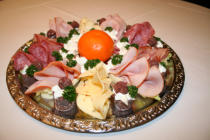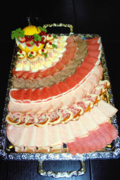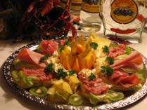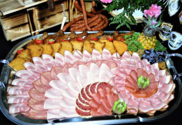 Hackepeterigel, Kochschinken, gebratenen Kassler, Salami, kräftigen Schinken dekoriert mit Früchten.